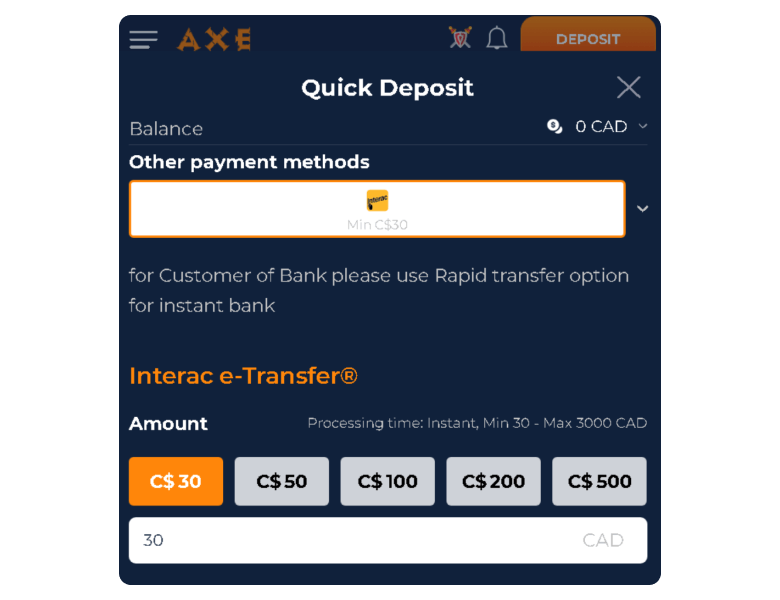 Deposit methods to receive bonuses at Axe Casino