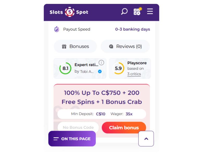 When I registered, the goal was to start small, get a feel of the platform, and then up the next deposit. With that in mind, I put in C$15 and got another C$15, with free spins and a bonus crab. Once I saw the bonus terms, I opted to use only the deposit match since the 35x is lower than the free spins' 40x. Still, that meant I had to top up and play C$525 to claim the C$70 I won from using the welcome bonus.