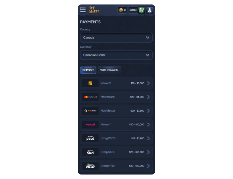 Deposit methods to receive bonuses at Betwarts Casino