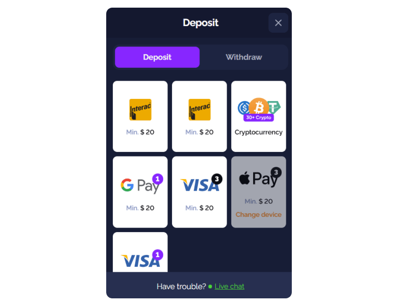Choose your payment method, Interac, Visa, crypto, etc. and deposit at least C$20. The bonus will activate automatically. For high rollers, deposit C$272+ to trigger the 200% match. For crypto, deposit C$41+ to activate the 150% offer.