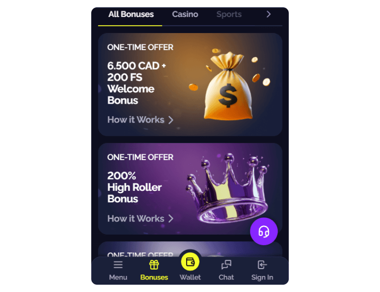 Use your bonus funds wisely, then move on to the next deposit bonus. Repeat the process through all four tiers to claim the full 550% up to C$6,500 and all included spins.