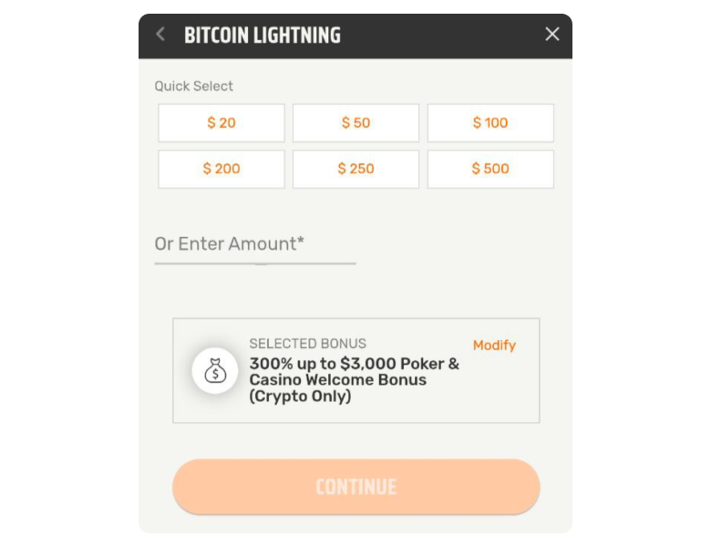 On the “Choose your bonus” screen, pick either the Poker & Casino Welcome Bonus for cards (200% up to $2,000) or the Poker & Casino Crypto Welcome Bonus (300% up to $3,000). And if you have a promo code, enter it in the “Enter Bonus Code” field before you continue.