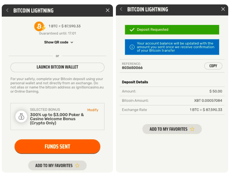 Complete the payment in your banking app or crypto wallet, then wait for the Deposit requested screen and the updated balance with the welcome bonus added to your Ignition account.