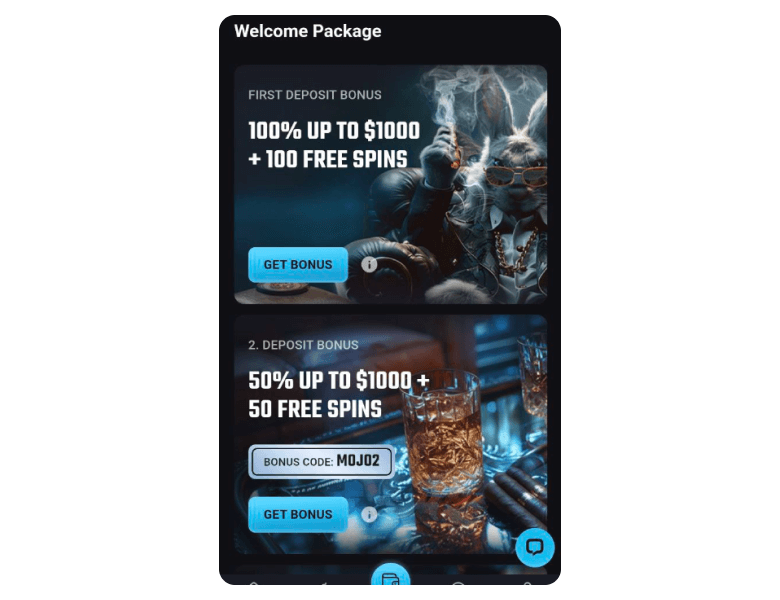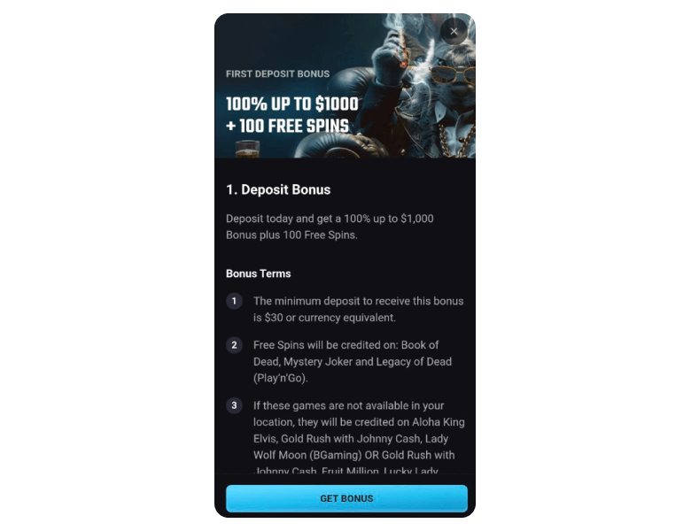 After selecting the bonus offer on our website, you'll be referred to PlayMojo. There, you are to make a qualifying deposit of at least $30 to receive the first offer of 100% up to $1000 + 100 FS. The remaining deposit bonuses require a promo code alongside the qualifying deposit.