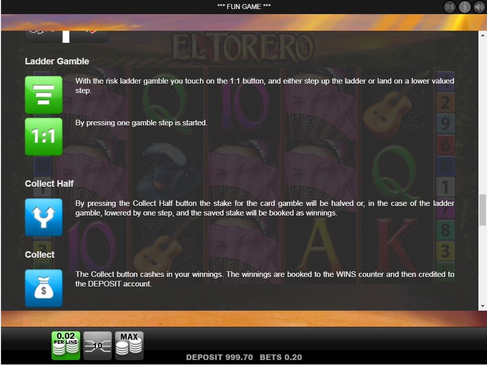 Der Spielautomat El Torero hat eine Risikospielfunktion, die ein ausgezeichneter Test der Intuition ist. Geeignet für alle, die gerne Risiken eingehen und dafür hohe Belohnungen erhalten. Das Risikospiel kann nach jeder Gewinnkombination aktiviert werden. Nach der Aktivierung müssen Sie die Farbe der Spielkarte erraten. Wenn Sie richtig geraten, werden Ihre Gewinne verdoppelt. Fahren Sie dann mit der nächsten Runde fort, indem Sie dasselbe tun. Mit dieser Funktion können Sie Ihre Gewinne um ein Vielfaches erhöhen. Es sei jedoch daran erinnert, dass das Spiel ziemlich riskant ist und die Möglichkeit besteht, verdiente Belohnungen zu verlieren. Dies kommt nicht oft vor, da die Chance, die Farbe der Karte zu erraten, sehr hoch ist.