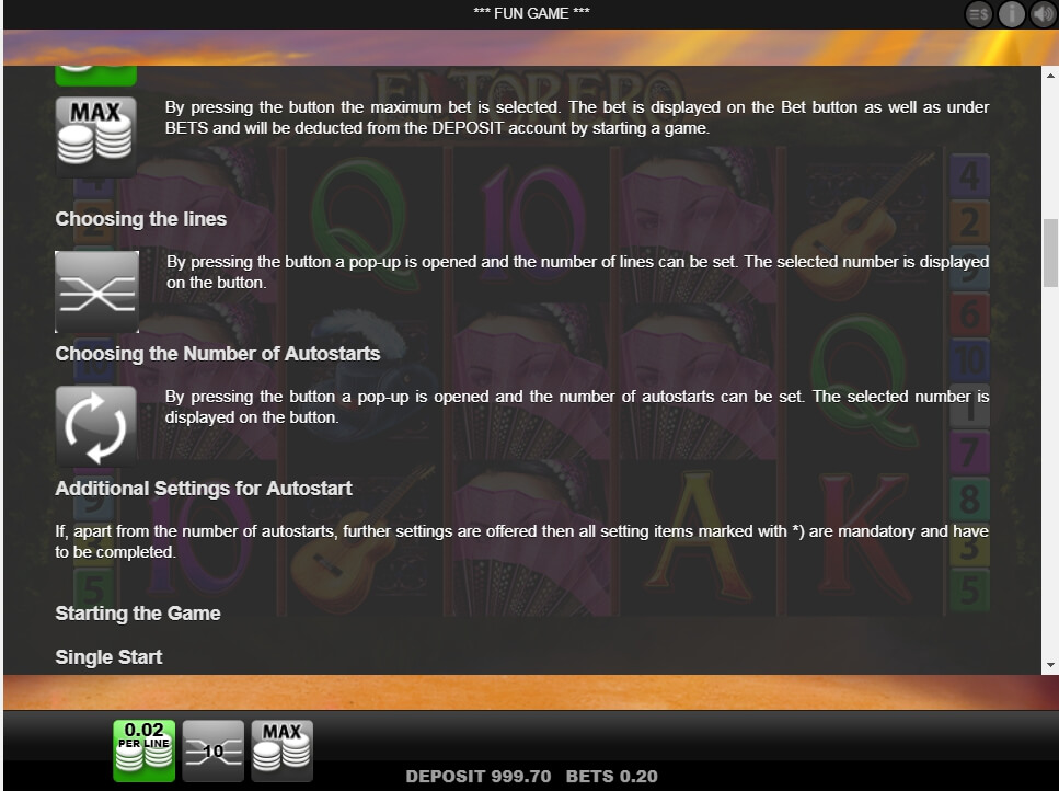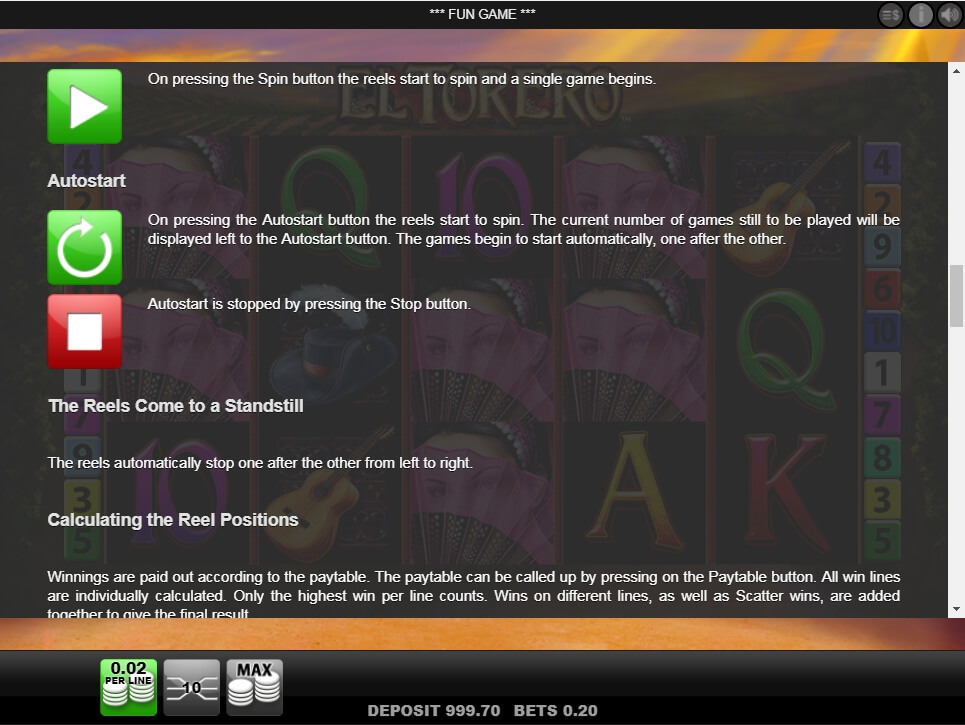 Der El Torero Slot hat eine sehr praktische Funktion, mit der Sie automatisch spielen können. Nachdem Sie die erforderliche Anzahl von Drehungen eingestellt haben, drücken Sie keine Tasten mehr und die Walzen drehen sich von selbst. So können Sie sich noch mehr auf das Spiel und Ihre Gewinne konzentrieren. Bei Bedarf kann diese Funktion deaktiviert werden.