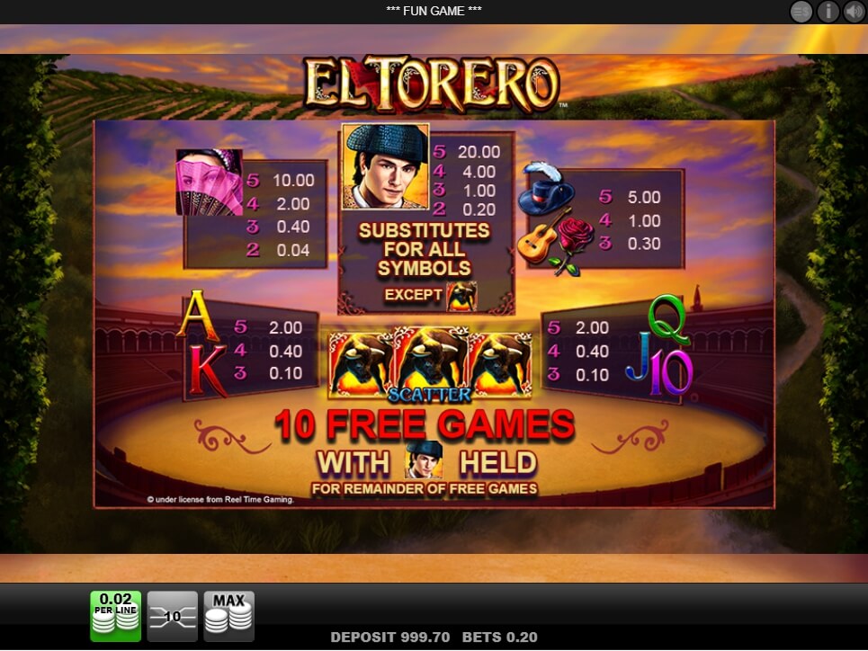 Der Spielautomat El Torero ist ideal für Einsteiger, die gerade erst anfangen, sich mit der vielfältigen Welt der Spielautomaten vertraut zu machen. Erfahrene deutsche Spieler werden auch den Online Slot mit hochwertigen Grafiken und vielen Bonusfunktionen zu schätzen wissen.