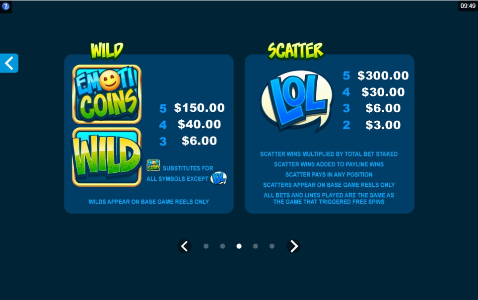 Spiellogo (Der neonblaue Text Emoti (anstatt O gibt es ein gelbes lächelndes Gesicht) steht über den hellgrünen Coins) ist ein Wild, das ein Recht hat , alle anderen Symbole außer sich selbst und Scatter zu ersetzen. Em:) Ticoins kann die Gewinnkombinationen bilden.