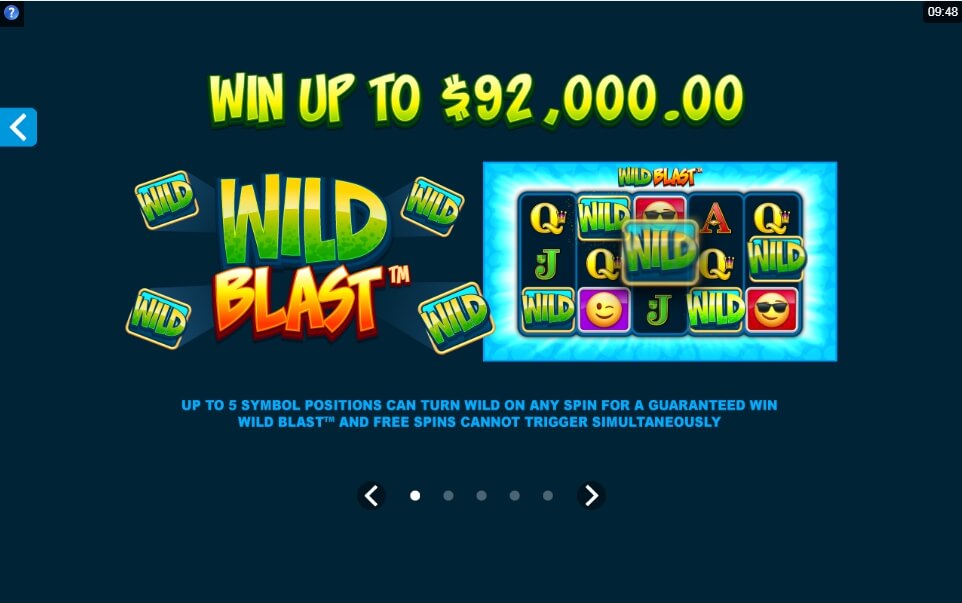 Wild Blast kann nur zufällig und nur während des regulären Spielautomat-Spiels aktiviert werden. Bis zu fünf Symbolpositionen werden transformiert. (Ein Hinweis: Außer Wild und Scatter )