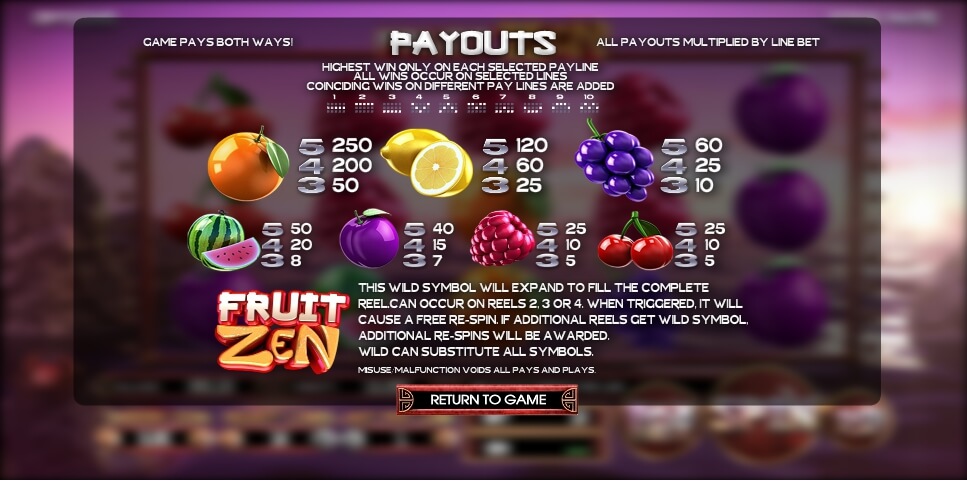 Der Fruit Zen Spielautomat bietet jedem Spieler viele Möglichkeiten. Ohne zusätzliche Runden hat ein Spieler immer noch die Möglichkeit, das Wild-Symbol zu finden, nämlich Fruit Zen. Es bietet Chancen, große Preise oder sogar einen Jackpot zu gewinnen, der im Hauptspiel progressiv ist.