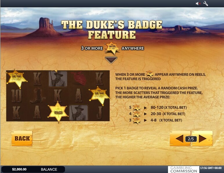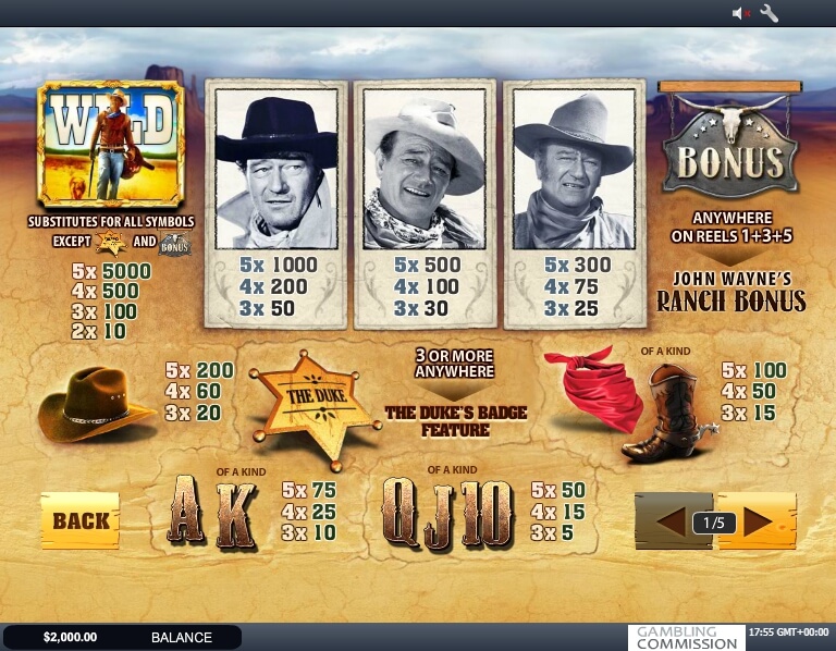 John Wayne ist selbst ein Wild-Symbol und kann am Ende des Spiels eine hohe Auszahlung bringen. Fangen Sie einfach drei John Wayne Symbole auf dem Bildschirm und Sie werden x3000 Multiplikator Ihres Geldes bekommen können! Außerdem kann das Wild Symbol alle anderen Spiel Ikonen in diesem Video SPIELAUTOMATEN ersetzen. Darüber hinaus gibt es auch ein Scatter-Symbol, das dem Spieler die Chance gibt, nicht nur Geld zu verdienen, sondern auch drei Freispiele zu spielen. Während der Freispiele kann der Spieler Rollen spinnen ohne Angst vor Geldverlust zu haben! Funktionen-Symbole wird auch im Spiel vorgestellt. Es kann eine Bonusrunde aktivieren, die wie ein echtes Abenteuer im Wilden Osten aussieht. Wayne wird mit einigen Leuten kämpfen und Sie werden echtes Geld für diesen Kampf bekommen. Sind Sie für ein weiteres Abenteuer mit diesem mutigen Cowboy bereit? Dann ist dieser Slot für Sie. Dies ist jedoch nicht alles, was Playtech den Spielern bieten kann. Sie werden auch erfreut sein, am Ende der Spielsitzung einen Multiplikator zu sehen. Es sieht wie ein Kartenspiel mit der Wahl zwischen roten und schwarzen Karten aus. Wenn der Spieler eine richtige Wahl trifft, wird sein Geld automatisch verdoppelt.