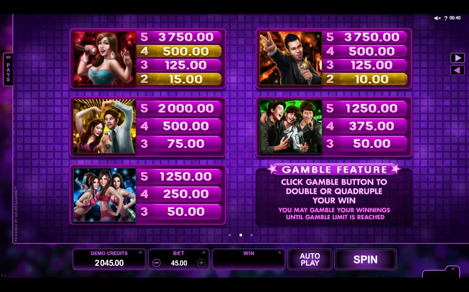 Das weiße Wort „Karaoke“, das ein bisschen schiff geschrieben ist, ist auf die in den Farben des Regenbogens gefärbten “Party“ (daneben sind dort die goldenen Linien und wenige Noten drauf; darunter liegt das schwarze Mikrofon). Beide Wörter sind zusammen auf dem fantastischen tiefvioletten Hintergrund platziert und machen ein Logo. Alle Gewinne, zu denen dieses Symbol beiträgt, werden 2 mal multipliziert. Es ist nicht schwer zu erraten, warum. (Ein Hinweis: Karaoke Party ist ein Wild-Symbol‘). Das neon weiß-blaue ‚SCATTER‘ über den geworfenen roten Würfeln ist ein weiteres besonderes Symbol. Sammeln Sie 3 „SCATTER“ und gewinnen Sie 15 Freispiele!! Die “Gamble“-Funktion ist ebenfalls vorhanden. Sie haben 5 Versuche zu gewinnen!