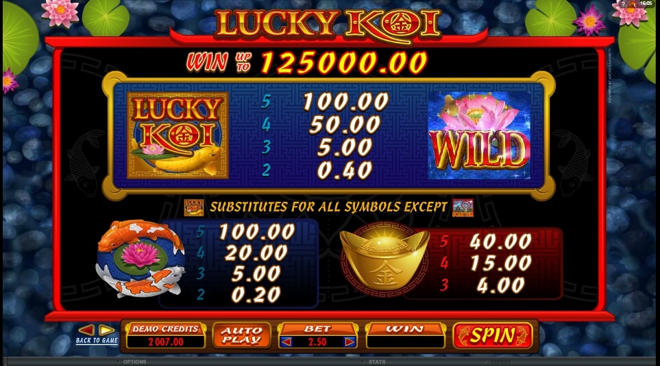 Niedrige Gewinnelemente werden durch eine Libelle, eine Schildkröte, einen Frosch, eine Lotusblume und einen roten japanischen Fächer repräsentiert und können mit bis zu 20 Punkten bezahlt werden. Hohe Gewinnelemente werden durch zwei Koi-Karpfen, Silber- und Goldpapierboote repräsentiert und können mit bis zu 100 Punkten bezahlt werden. Der maximale Jackpot in diesem orientalischen Teich kann bis zu 5000 Punkte erreichen.
