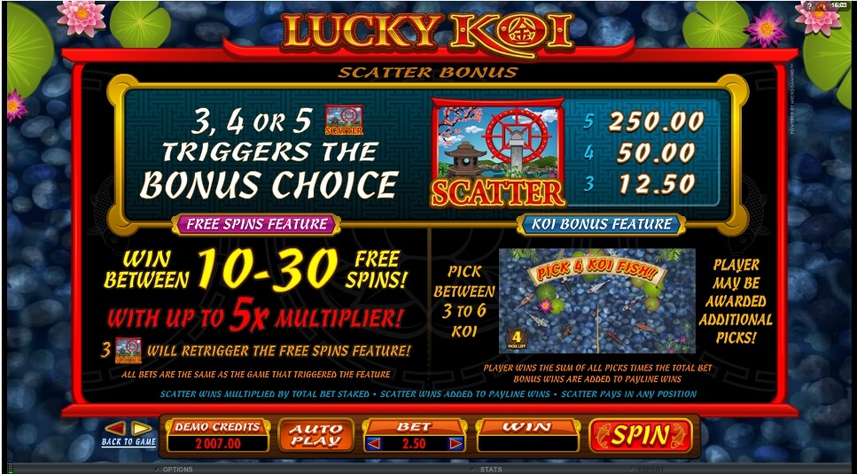 Der Lucky Koi ist das wilde Element, das seine eigenen gewinnbringenden Kompositionen aufbaut und jedes Element außer einer verstreuten japanischen Wassermühle ersetzt. Das Scatter-Element kann eigene Scatter-Gewinn-Kompositionen erstellen. Drei oder mehr japanische Wassermühlen auf den Walzen bieten dem Spieler zwei Bonusprogramme – Freispiele oder den Koi-Bonus. Im ersten Bonusprogramm kann der Spieler mit bis zu 30 kostenlosen Rotationen und einem 5X Multiplikator präsentiert werden. Wenn der Spieler wieder drei Mühlen bemerkt, wird das Programm erneut ausgelöst. Im zweiten Programm wird der Spieler angeln gehen. Es gibt bis zu 6 Koi-Karpfen im Teich. Jeder wird den Bonusbetrag präsentieren, der am Ende des Programms summiert wird.