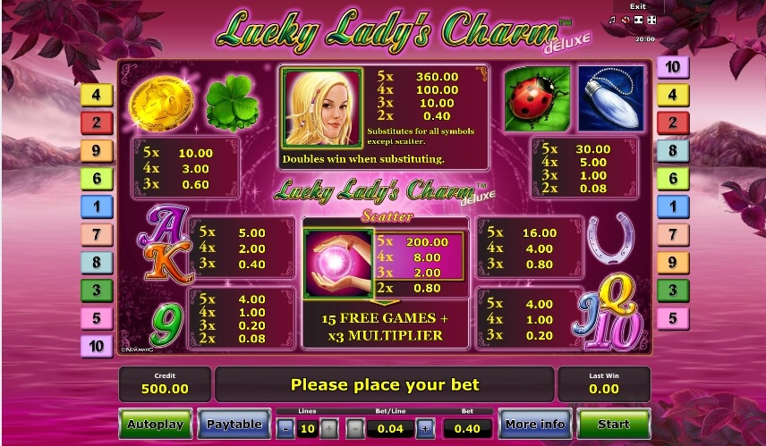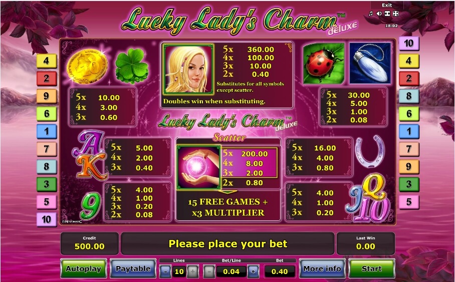 Die gute Eigenschaft dieses Casino Slots ist die Tatsache, dass, wenn Sie Spielautomat Lucky Ladys Charm Deluxe spielen möchten, können Sie es online tun und müssen sich nicht irgendwo registrieren oder den Spielautomaten herunterladen. Novomatic vereint alle positiven Eigenschaften traditioneller Casinospiele und ganz neue Funktionen, um die Spieler zu überraschen.