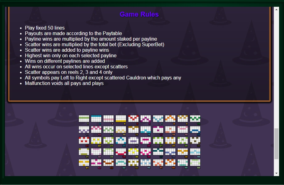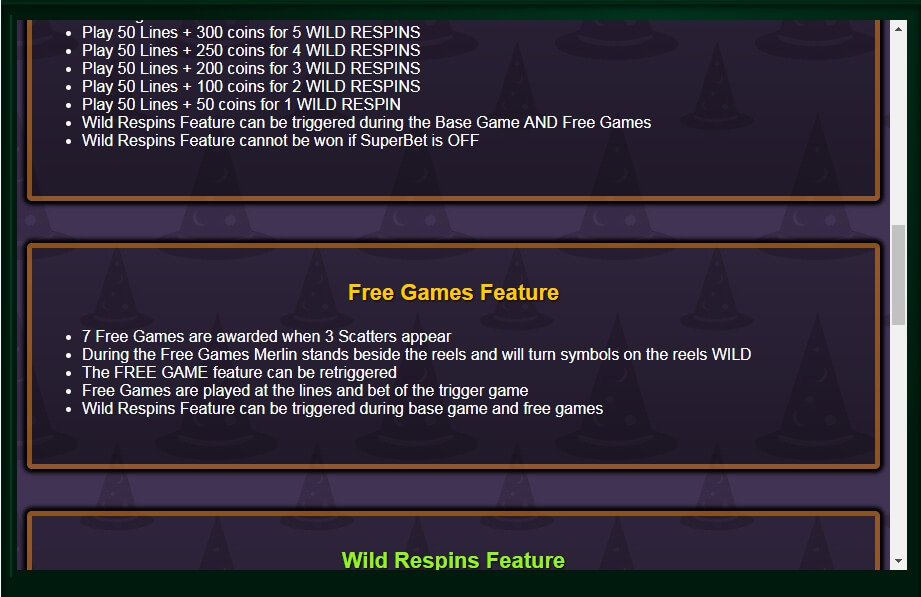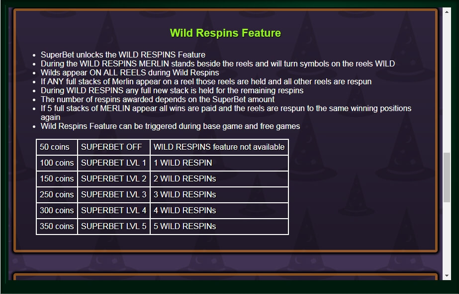 Grüner Zauberstein – wenn sich 10 dieser Symbole auf dem Spielfeld befinden, erhält der Spieler die Hälfte seines Einsatzes zurück. Bei 22 oder mehr Symbolen erhöht sich der Einsatz um das 50-fache.