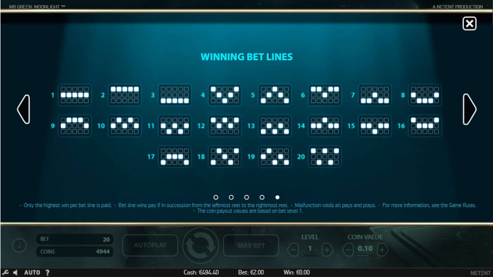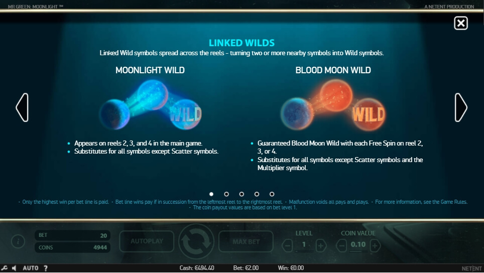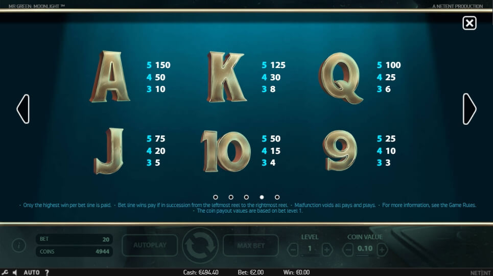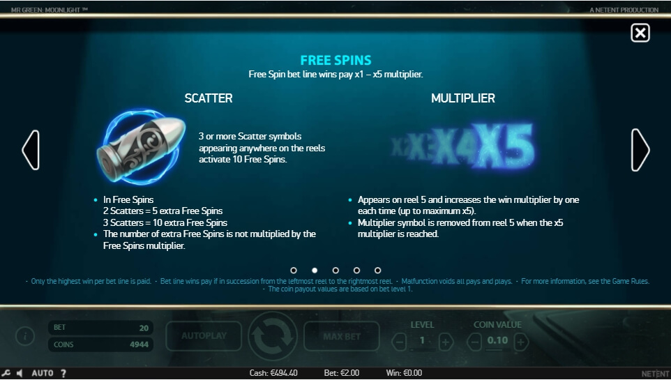 Mr Green Moonlight Online hat eine einfache Regel: sammeln Sie passende Zeichen auf der gleichen Gewinnlinie und Sie erhalten Boni. Verwenden Sie sie, um den Gewinnstand ein paar Mal zu erhöhen. Es bedeutet jedoch nicht, dass der Spieler nur ähnliche Gegenstände sammeln sollte. Er muss den Richtigen wissen, um das zu tun. Einer der besten von ihnen ist das Zeichen Silberkugeln. Sie können das spezielle Minispiel mit Freispielen aktivieren. Aktivieren Sie sie, um tolle Gewinne zu erhalten. Aber vergessen Sie nicht den Jackpot mit über 1500 Münzen! Der “Wirklich für den Spieler“-Koeffizient beträgt etwa 96 Prozent.