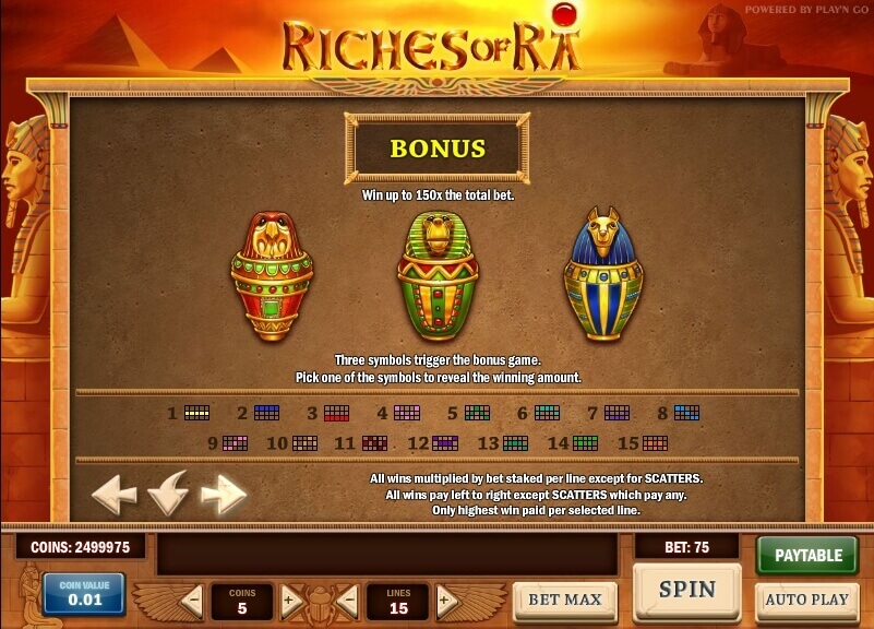 Es ist garantiert, dass, wenn dieses Bild das 1. und 5. Schlagzeug bedeckt, 15 Freispiele aktiviert werden, in welchem Moment Bilder von Gott Ra, die durch das Symbol herausgefallen sind, während aller Freispiele fixiert sind. Die Zeichen mit dem Bild der Krüge sind Zerstreuungen, von denen jeder seinen eigenen spezifischen Multiplikator hat. Wenn drei solcher Charaktere an einem beliebigen Ort auf verschiedenen Trommeln erscheinen können, wird ein zusätzliches Gewinnspiel aktiviert, das darin besteht, einen der Krüge auszuwählen, dessen Multiplikator die Gewinne eine bestimmte Anzahl von Malen erhöht. Erhöhen Sie den Preis mit diesem Spiel kann bis zu 150-Mal erreichen. Nach jeder Preiskombination bietet dieser Video Spielautomat ein Risiko-Spiel, welches den Preis verdoppeln kann.