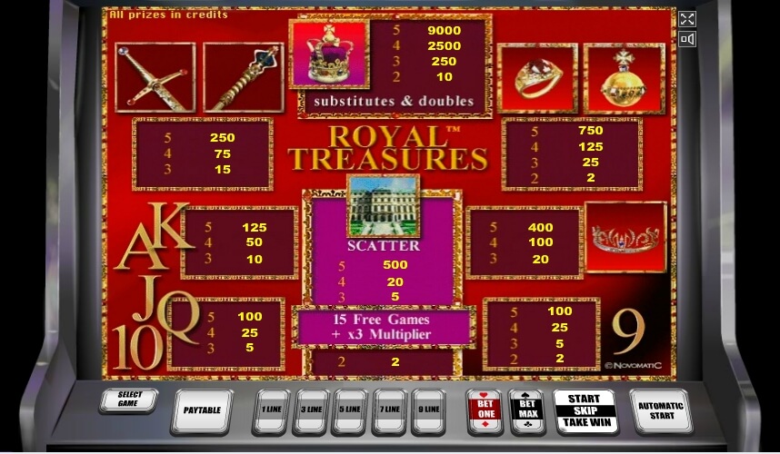 Dies ist ein traditioneller Video-Spielautomat mit 5 Walzen und 9 Gewinnlinien. Die Anzahl der Gewinnlinien im Spiel ist ziemlich gering. Üblicherweise bieten Entwickler mindestens 15 Linien pro Spiel an, um es einfach und leicht zu machen. Interessant ist es aber auch, Royal Treasures mit 9 Linien zu spielen. Der Jackpot im Spiel beträgt 9.000 Münzen und es sind gute Nachrichten! Der Minimaleinsatz an Royal Treasures ist 1 Münze pro Drehung. Autoplay-Option und Multiplikator werden ebenfalls am Spielautomaten angezeigt. Autoplay sollte zu Beginn des Spiels manuell aktiviert werden. Es gibt zwischen 10 und bis zu 100 automatische Drehungen. Der Multiplikator wird automatisch nach jeder Glücksdrehung aktiviert. Es kann dem Spieler helfen, Geld zu verdoppeln. Natürlich nur, wenn der Spieler eine richtige Karte zwischen roten und schwarzen Karten auswählt.