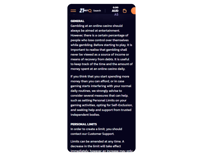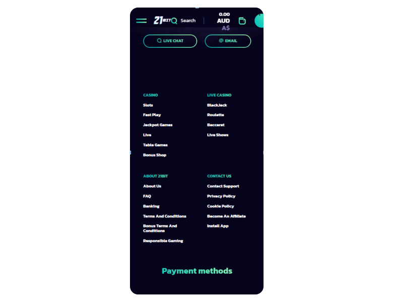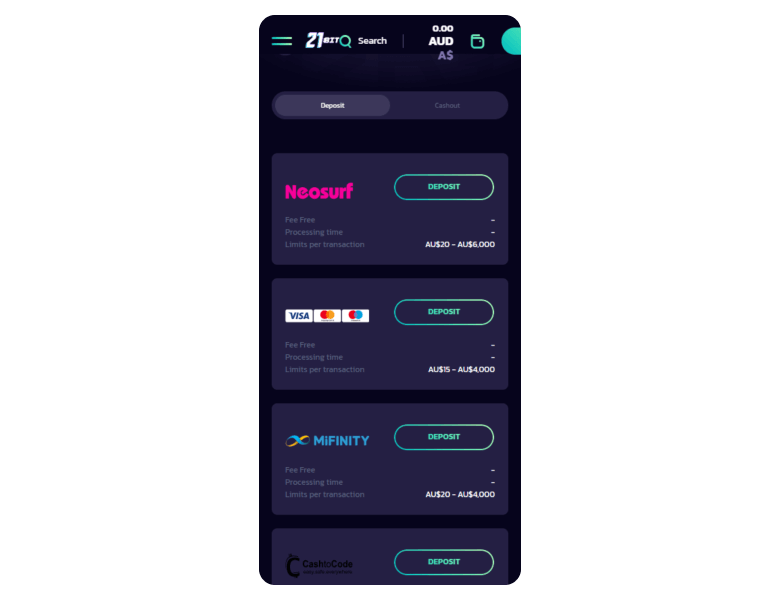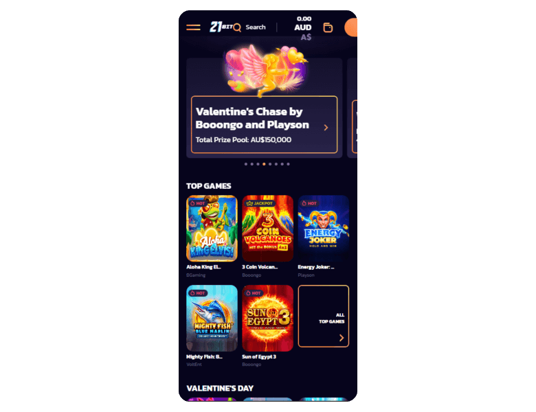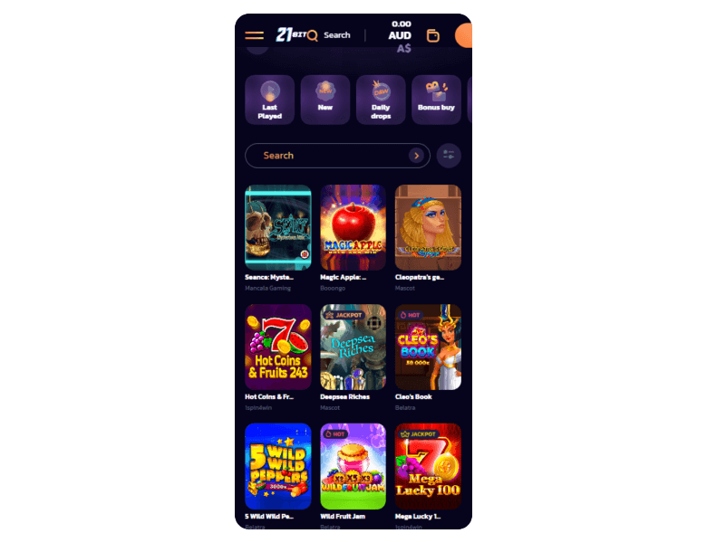 21bit Casino is a good place to play with small amounts, as the minimum deposit there is just A$15. Although its live game section is not large, the catalog includes 4,000+ slots from top providers like Tadagaming and Onlyplay.