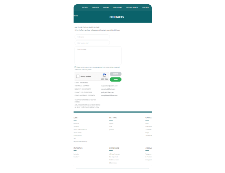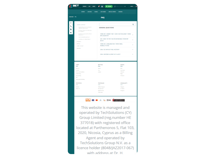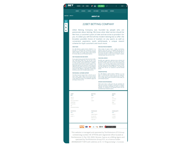 They have a proactive live chat team that responded to me in under 2 minutes. There are also email and contact form options. 22Bet Casino is licensed in both Curacao and Kahnawake, supporting over 100 currencies and 50 languages.