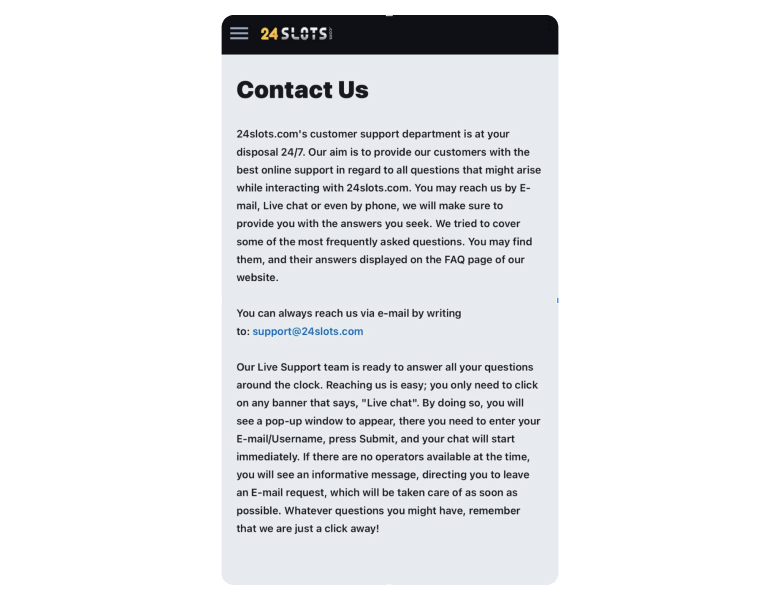Compared to SlotHunter, where live chat can vanish after midnight, 24slots keeps the lights on. Customer support felt reliable. It’s not perfect, but agents answered questions clearly without pasting template responses. A phone option would polish the edges, yet the current setup solves 95 % of issues on the spot.