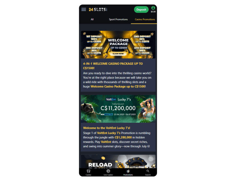 The welcome package gives a C$1,500 head start split over four deposits. After that, weekly reloads and cashback continue to fuel the excitement.