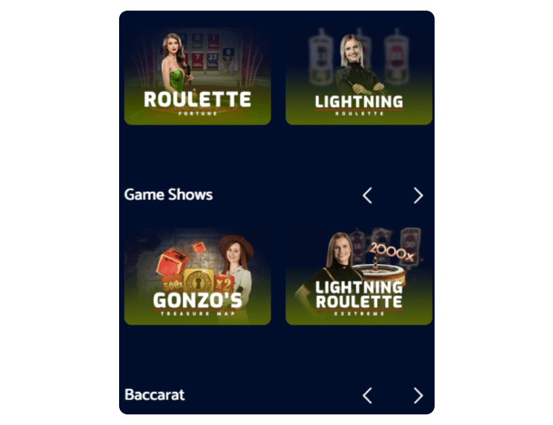 Includes blackjack, roulette, baccarat, and game shows