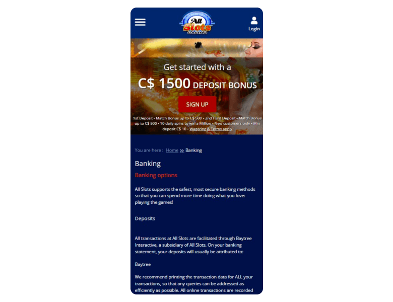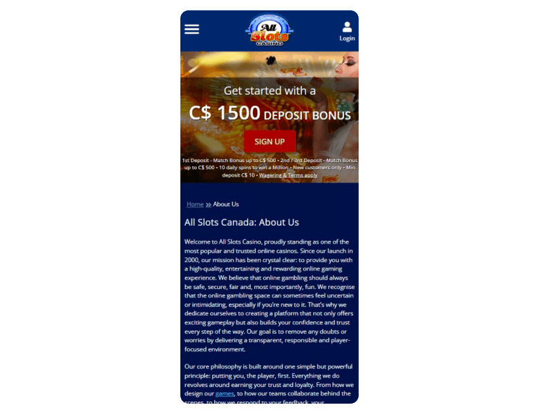 I came across All Slots while checking what the Canadian market has to offer, and the fact it was established in 2000 was the first thing to make me curious enough to test it. Right away, I noticed it has a mobile app, and wow, that worked fast on my iPad, especially considering most “old” platforms don’t rely on mobile gaming that much.