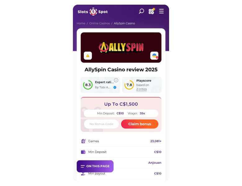 I signed up with AllySpin Casino and spent a couple of days testing its games, payments, and overall usability. My first impression was that registering was quick, and I deposited C$50 using Interac, which processed instantly.