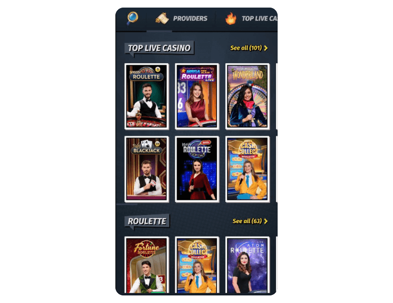 All the games I expected to see in its live dealer section were present. I could just scroll or type in roulette, blackjack, baccarat, or game shows to find them. Providers like Evolution and Pragmatic Live own the tables in this section.