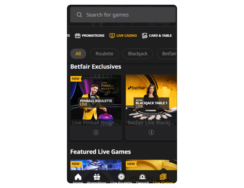 The 38 live games at Betfair feature high-quality graphics and soundtracks, thanks to a partnership with top-tier providers like Evolution and Blueprint Gaming. I interacted with fellow players as we engaged in Funky Time, Deal or No Deal, and Mega Wheel, making the whole thing lively. However, the operator should consider increasing the number of games to match 30Bet Casino’s variety.