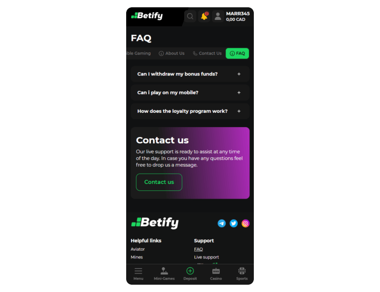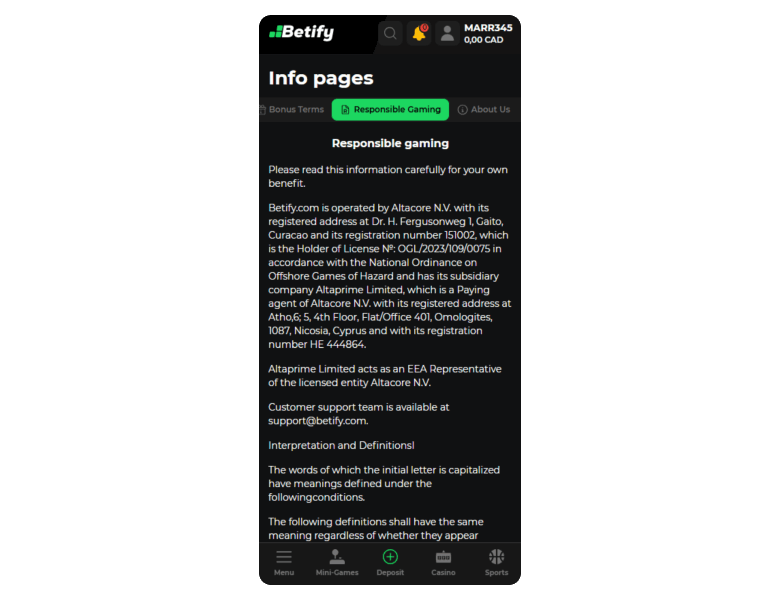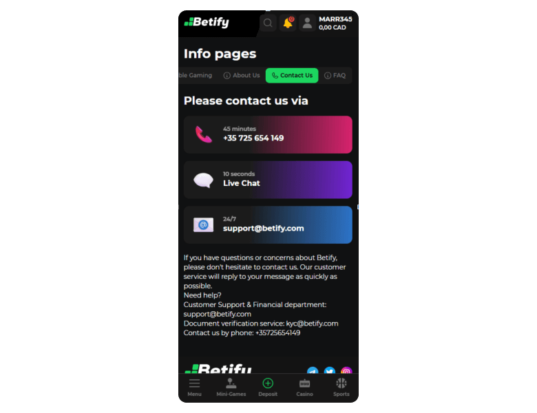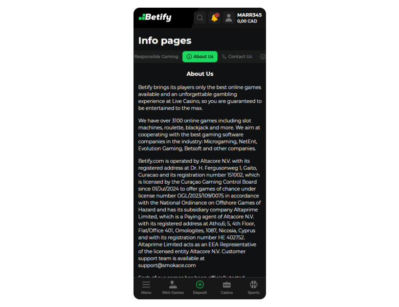 Betify Casino is a decent iGaming platform with transparent terms of use, but I wish it did not have a minimum C$100 payout requirement for major cryptocurrencies like USDT and BTC.