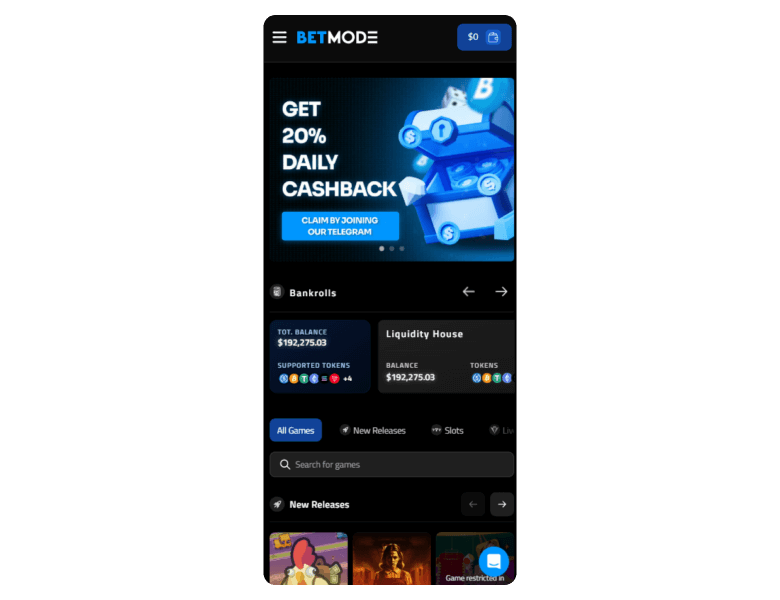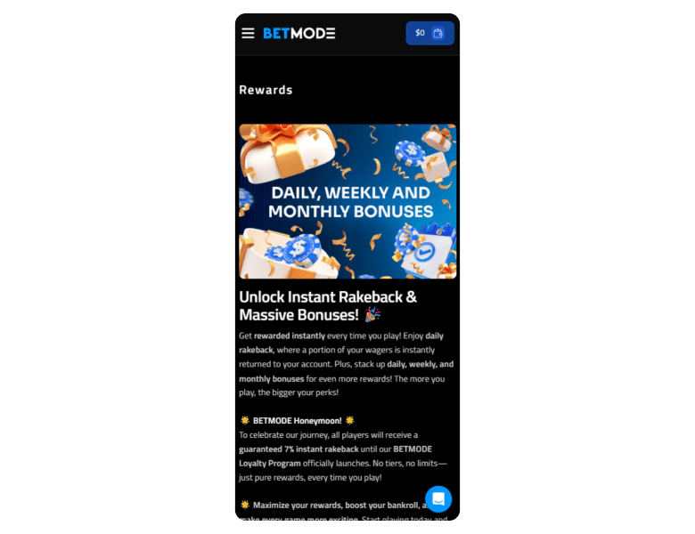 Bonuses and promotions at Betmode.io are mostly cashbacks and rakebacks, even for new players. Although Betmode.io does not offer the same variety of bonuses as traditional fiat casinos, the available deals are still generous.