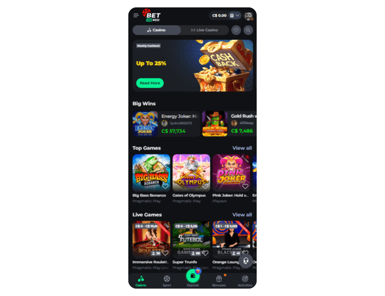 The online casino was launched in 2022 and operates legally, which, as I checked, is confirmed by the current license of the Curacao Commission. Among other things, I was impressed with the BetOnRed bonus program. New customers receive up to C$675 + 250 Free Spins from the operator after the first deposit.