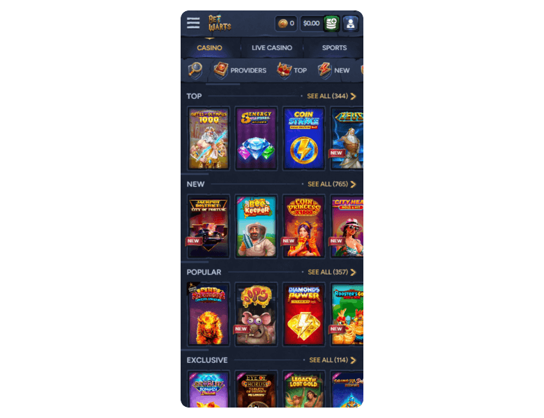 Such a collection of games only means the operator sources from multiple brands. In the case of Betwarts, we found 80+ providers, including big brands like Booongo and lesser-known ones like Game Time Tec.
