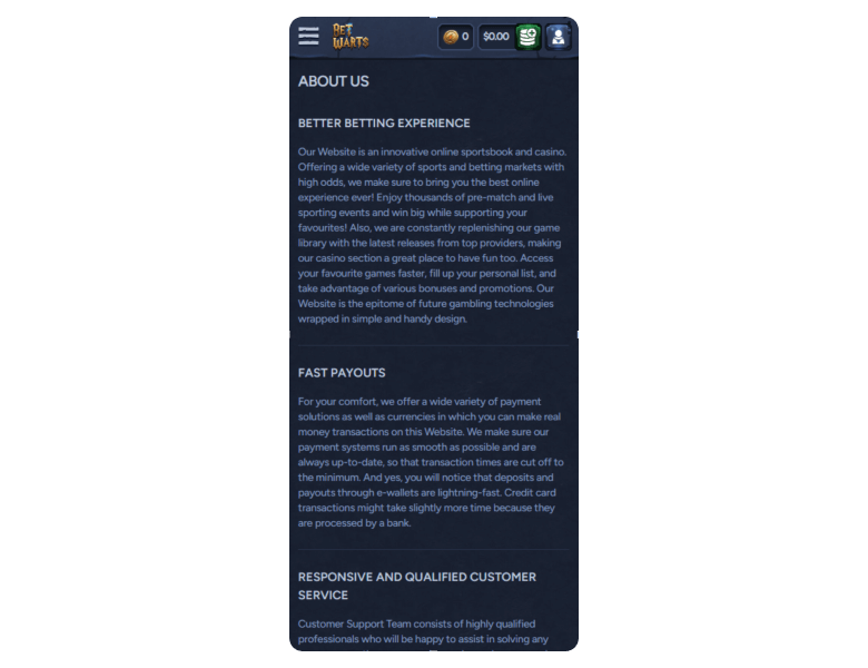 Footnote: For the best experience playing at Betwarts, consider using the mobile web version. It makes navigation easier than the desktop website because the buttons appear bolder and clearer.