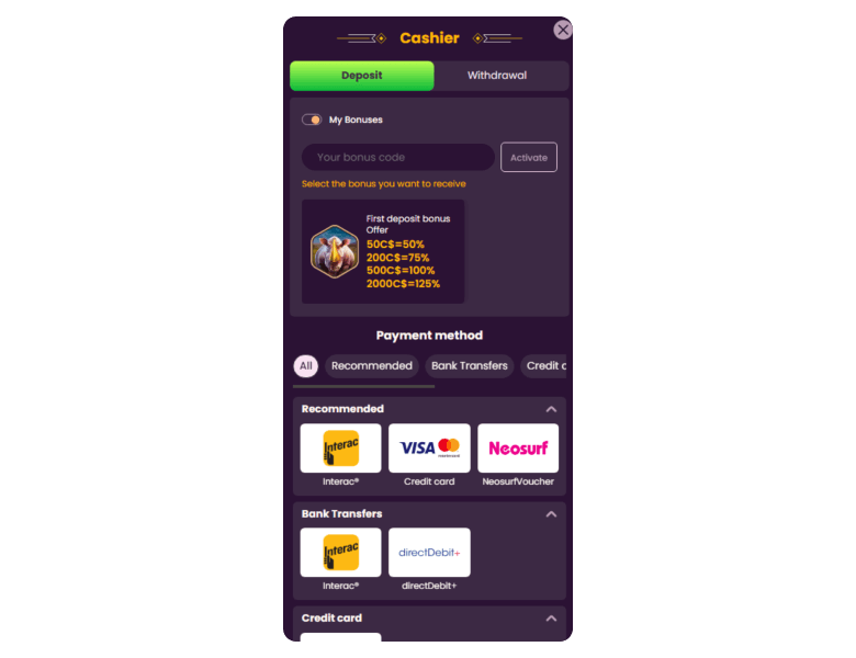The welcome package, which includes a match bonus of up to C$7,250 and 175 free spins, was another pleasant surprise for me. However, even though the minimum required deposit is C$8, I had to pay C$20 to become eligible for the bonus offer.