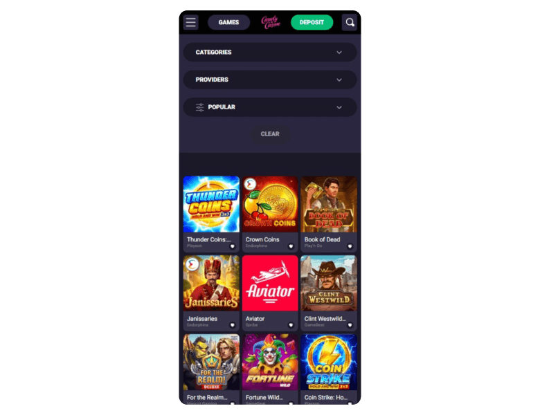 Candy Casino has games from Pragmatic Play, Play’n GO, Nolimit City, Red Tiger, Spinomenal, BGaming, Booming Games, Habanero, and Evolution for live tables.