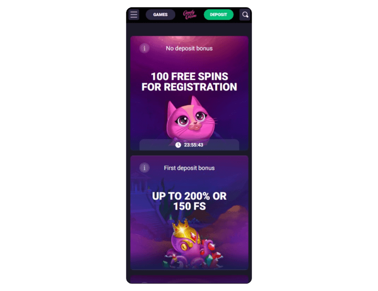 Yes. Candy Casino accepts BTC, ETH, LTC, and others. Crypto deposits are processed instantly, while crypto withdrawals usually take up to 24 hours once KYC is completed.