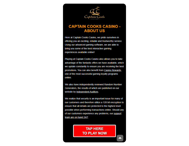 Review Disclosure: The content of this review is my judgement of Captain Cooks Casino, based on testing its offers, payments, and games.