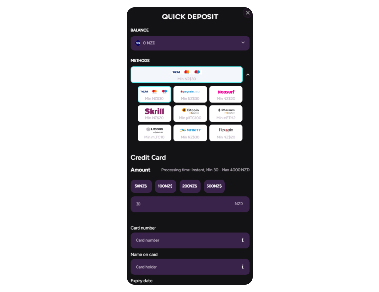 I like the fact that the site accepts multiple payment methods, including crypto. After signing up, I deposited NZ$20, as it’s the minimum deposit amount. The only minor inconvenience is that the withdrawal limit is NZ$6,500 if you use Skrill.