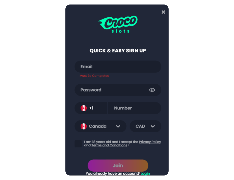 Creating an account at Crocoslots Casino took just a few minutes. Here's how I registered to help you get started: