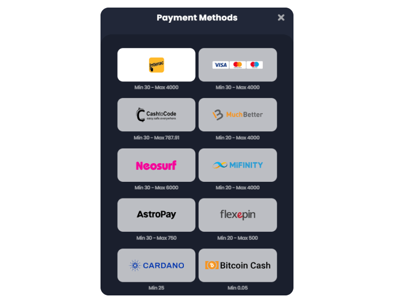 Crocoslots embraces both traditional and crypto payment options, making it versatile for different player preferences. There are over 20 payment methods, including popular options like Interac and CashtoCode for Canadian players.