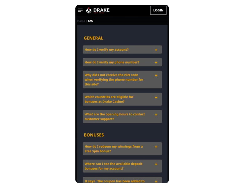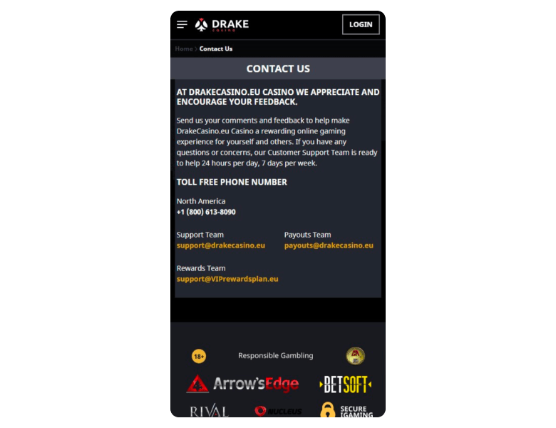As for customer support, Drake Casino has 24/7 live chat, email assistance, and even phone support, which isn’t very common with modern casinos, so it’s a benefit for those who like to solve issues over a phone call. A contact form is missing, but it actually doesn’t feel like it would be a game-changer to me if it was here. As for the speed, it was 1 minute on average via live chat and 8 hours on average via email.