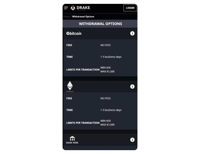 Drake Casino offers just the bare essentials: cards and a handful of cryptocurrencies. The process itself was not very exciting for me. OK, the deposits seem to be fine, but the withdrawals could be better. First, it’s only two options to pick from: Bitcoin and Wire Transfer. Second, processing times up to 12 business days? That’s not even funny. Even Bitcoin can take up to 3 days, while other casinos process crypto payouts instantly.