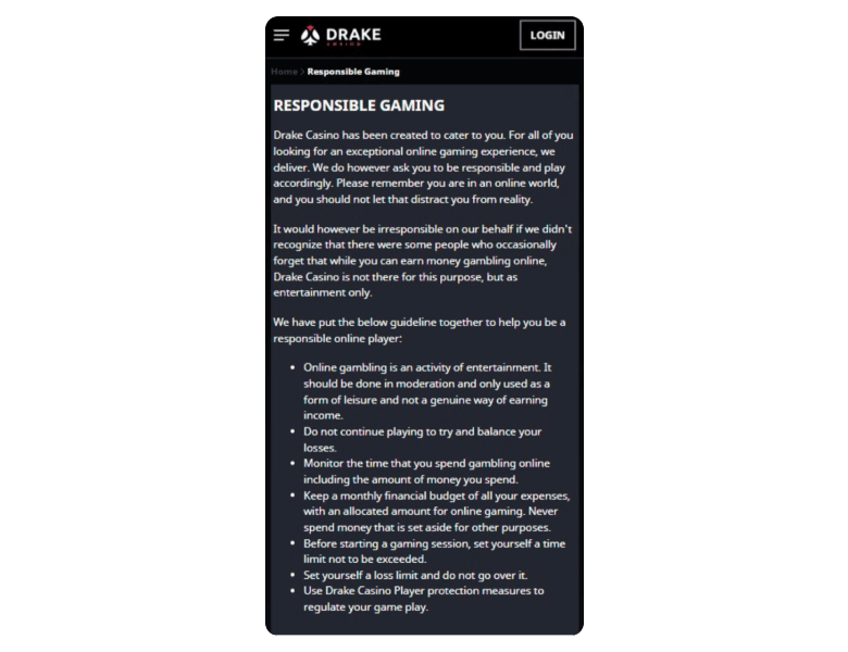 Responsible gambling options at Drake Casino include some basic measures like deposit limits, cooling-off periods, self-assessment tools, and self-exclusion in case you need it. However, some important features like reality checks and links to support organizations, which are present at better-regulated casinos, are missing here. So, most tools are in place, but it’s not a full set — you have to control how long you’re playing yourself and do your own research on help agencies.
