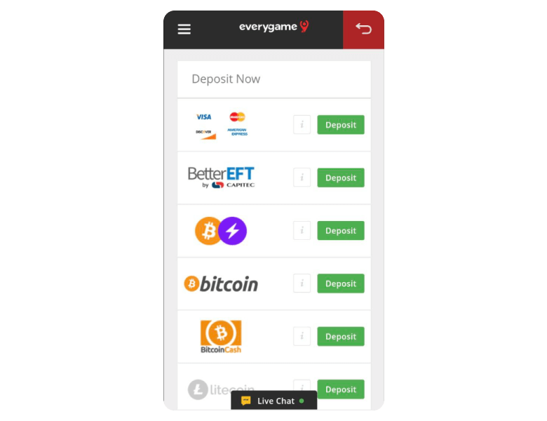 For cashouts, Everygame supports eChecks, bank transfers, and most popular tokens.