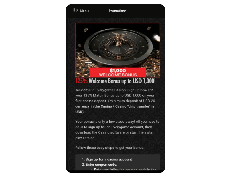 Everygame is built with HTML5, which makes it optimised for mobile browsers like Opera, Chrome, and Brave. The casino has not yet created a native app for Android and iOS, but its site is sufficient for mobile play.