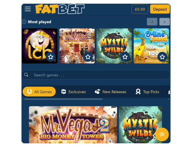 Fatbet doesn’t have the creative flair of Dunder casino for design, nor does it have the polished app of Cocoa Casino. But it does manage to work on both levels. The HTML5 mobile website uses an unembellished design, which works in favour of easy navigation and focused gaming.